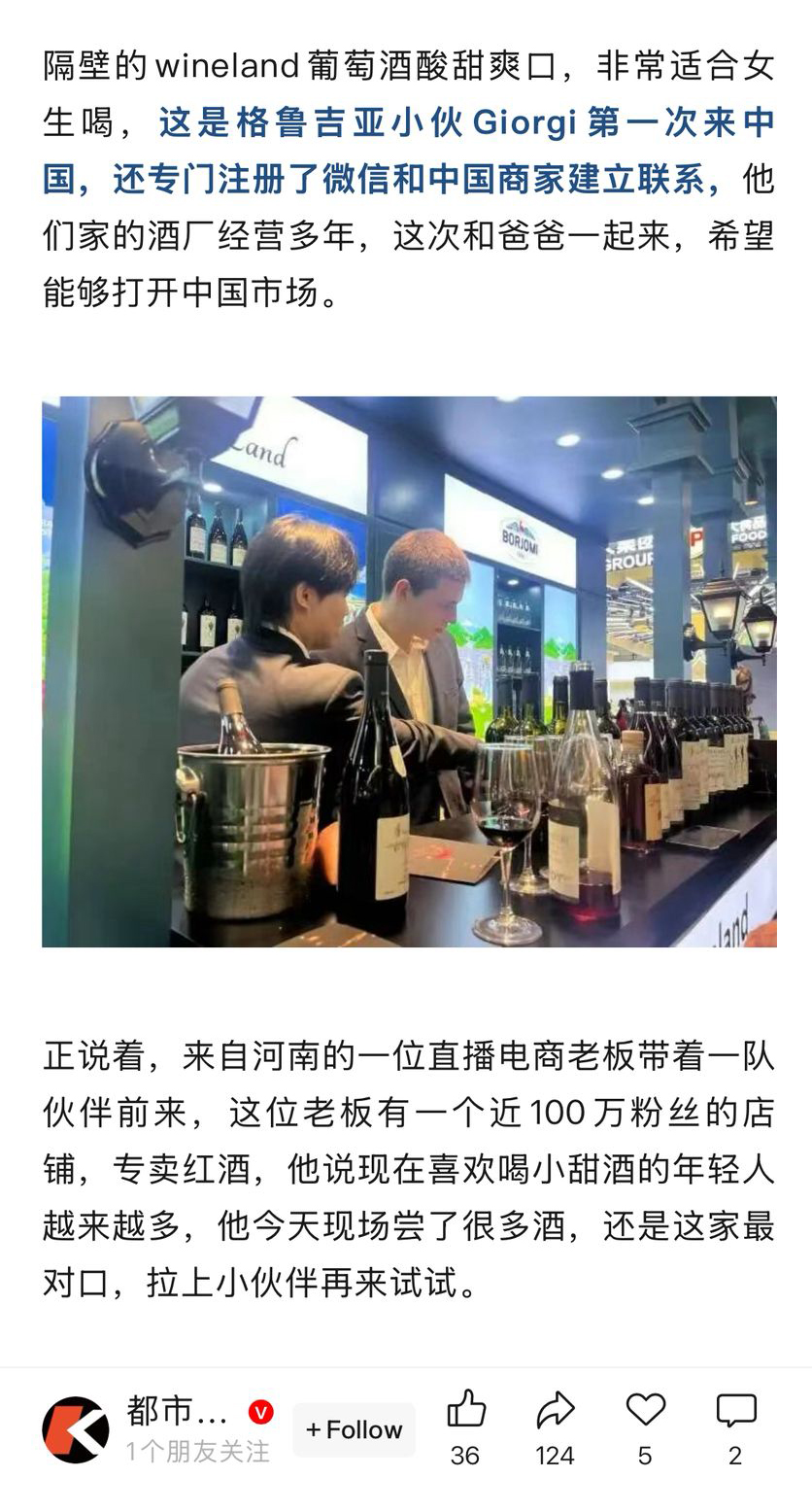 Next door, at the Wineland booth, the wines are sweet and refreshing — very suitable for women. This is Giorgi from Georgia's first visit to China. He even registered on WeChat and connected with Chinese business partners. Their family has been running their winery for many years. This time, he came together with his father, hoping to open up the Chinese market. Just as we were talking, a livestream e-commerce boss from Henan came over with his team. This boss owns an online store with nearly one million followers, specializing in selling red wine. He said that more and more young people now like drinking sweet wines. He tasted many wines on-site today, but said this one was his favorite, and he plans to bring his partners back later for another tasting